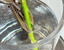 お店でも行なっている水を吸い上げやすくする処理です。購入後長時間持ち歩いたときや、元気がなくなったときに行なってください。 これは「水揚げ」といい、茎の切り口を新しくすることで水を吸い上げやすくします。水の中で下から2〜3cmほどを斜めにカットします。水の中でカットすることで導管に空気が入ることを防ぎます。また、斜めにすることで水に触れる切断面を大きくすることができます。