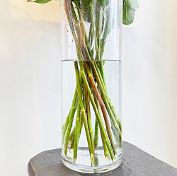 お花は葉からの水分の蒸発に水の吸い上げが追い付かないとしおれてしまいます。 また、花瓶の水の中にバクテリアが増えると、水を吸い上げる導管にバクテリアが入り込み、水を吸い上げることができなくなってしまいます。同様に、葉が花瓶の水に浸かると細菌が増えるため水量にあわせ葉を取り除きます。